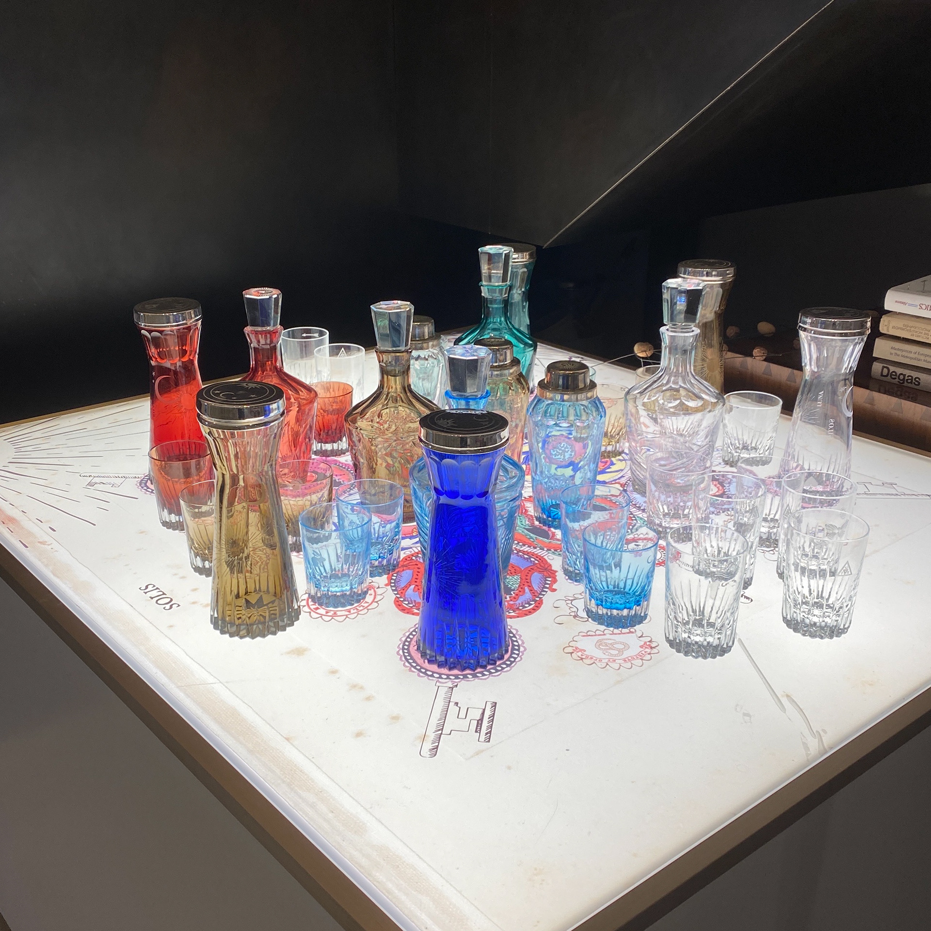 expanded the glassware line by working with Italian glass workers utilizing the foundrae iconography